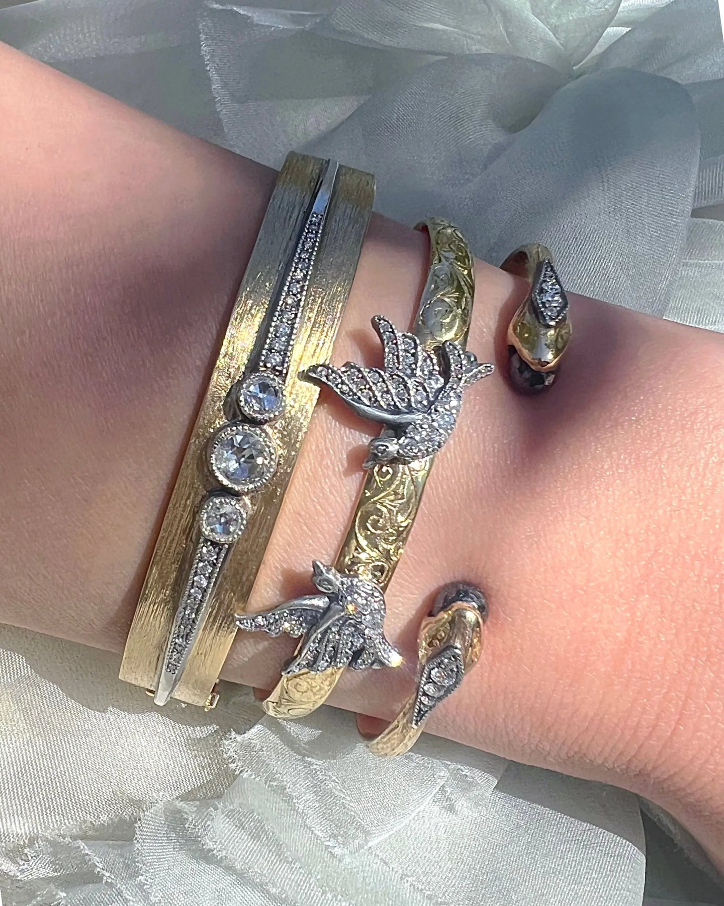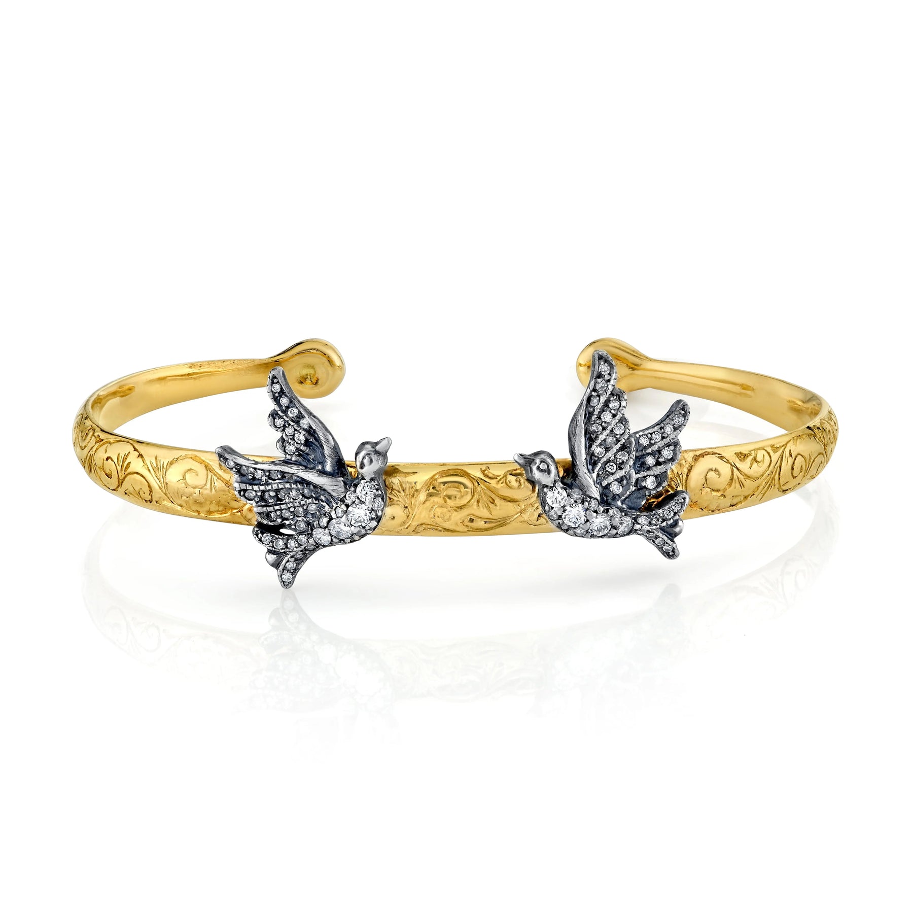 Love bird cuff bracelet diamond love birds in 18k gold and oxidized silver