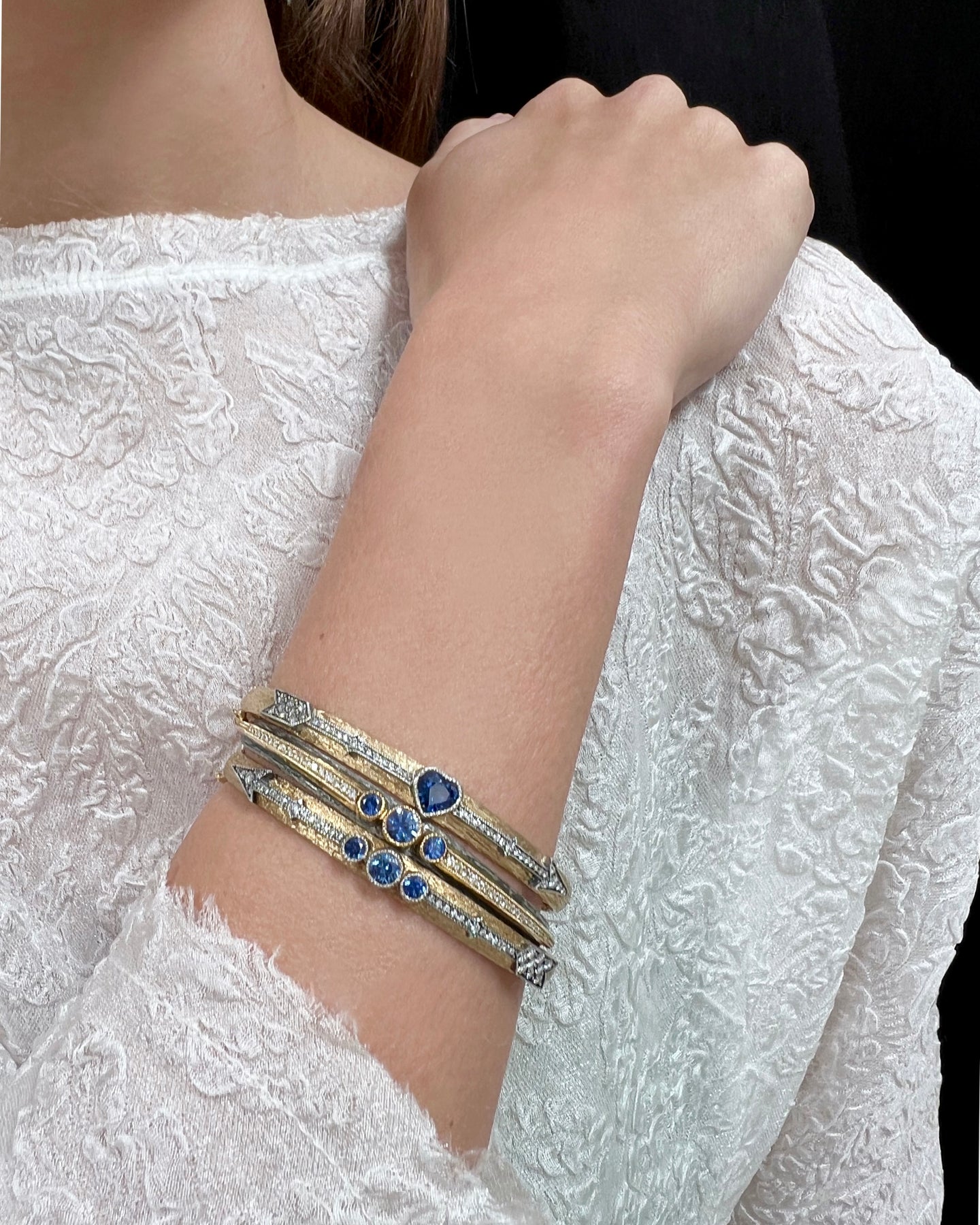 Diamond & sapphire arrow gold bracelet in 18k gold and oxidized silver