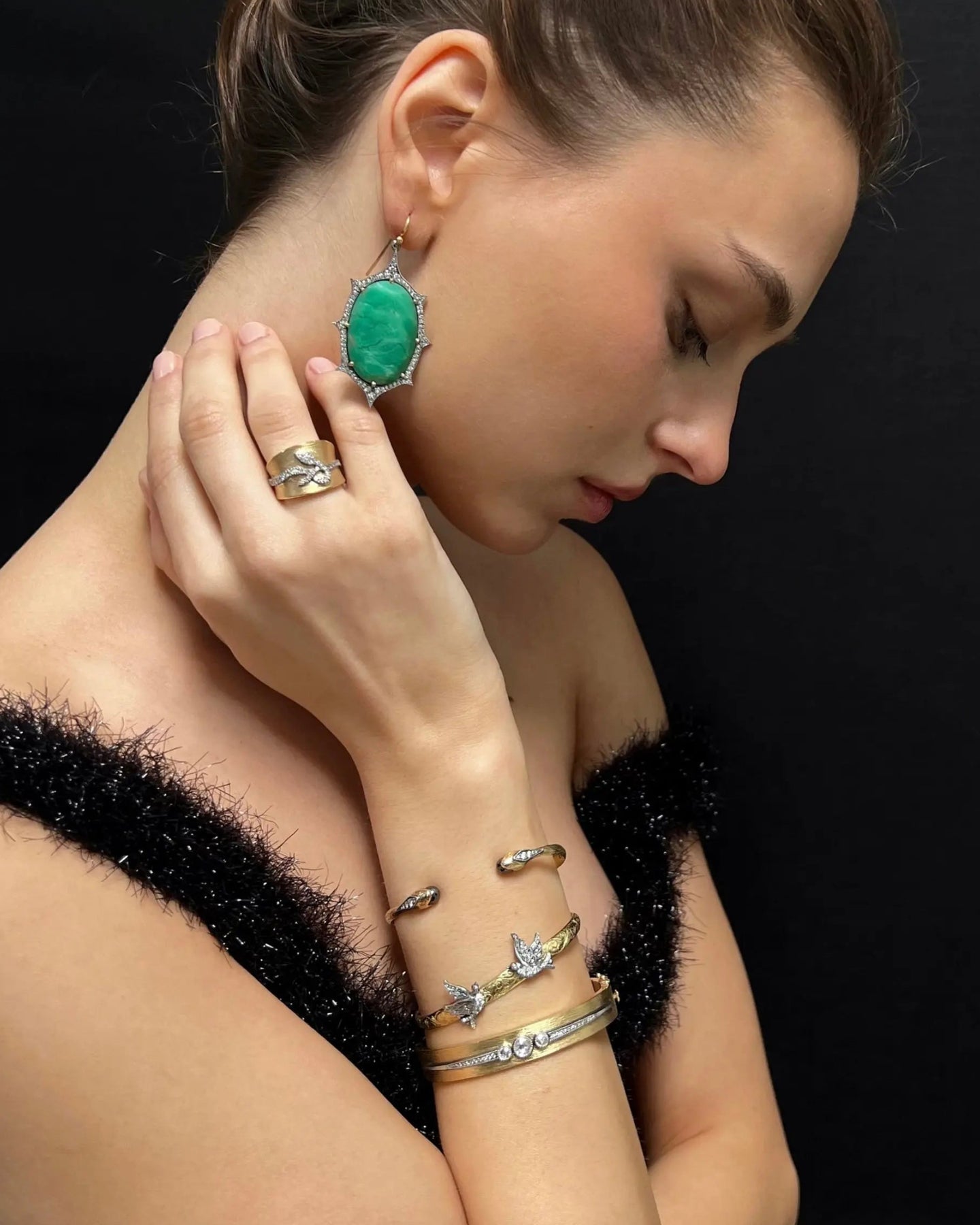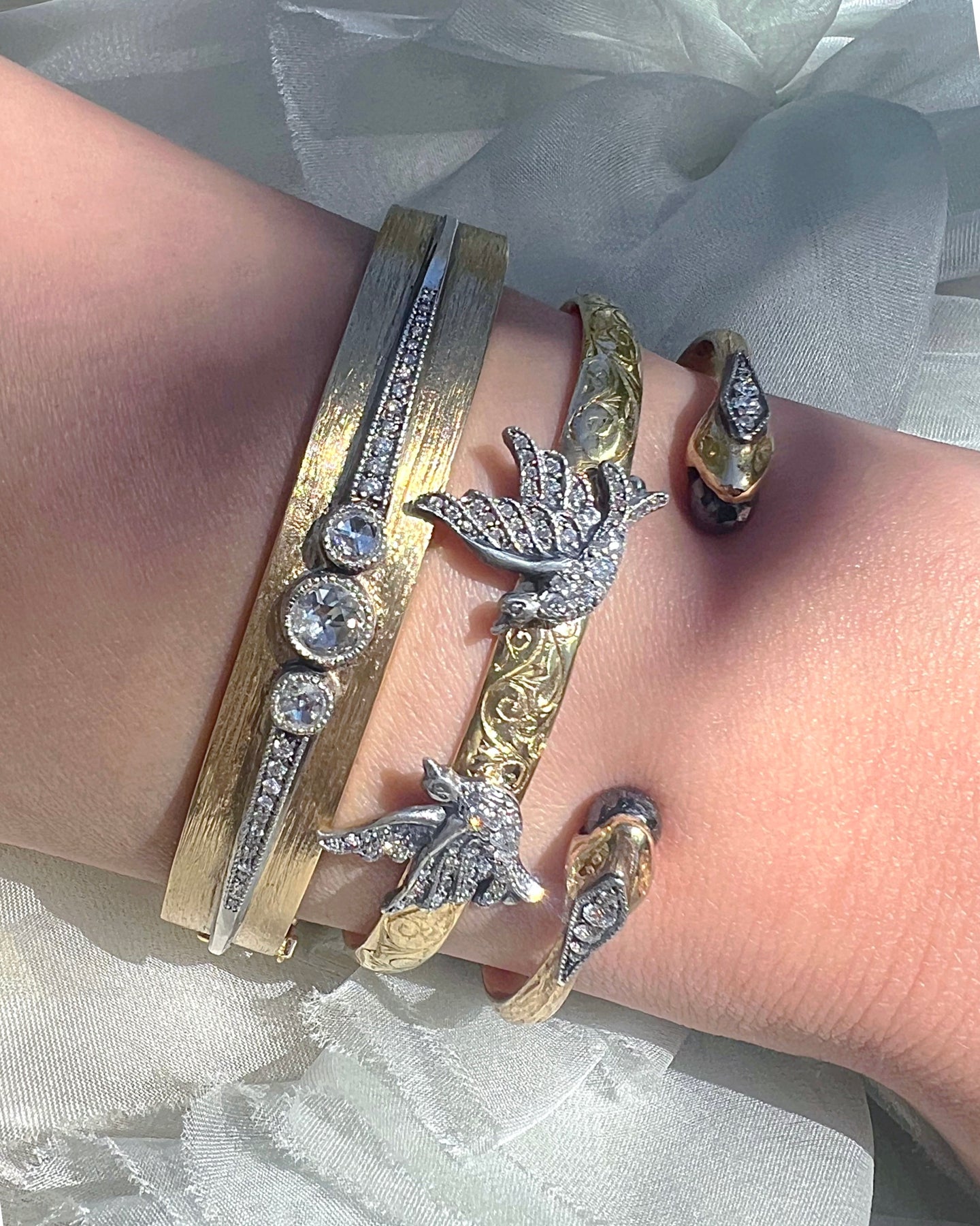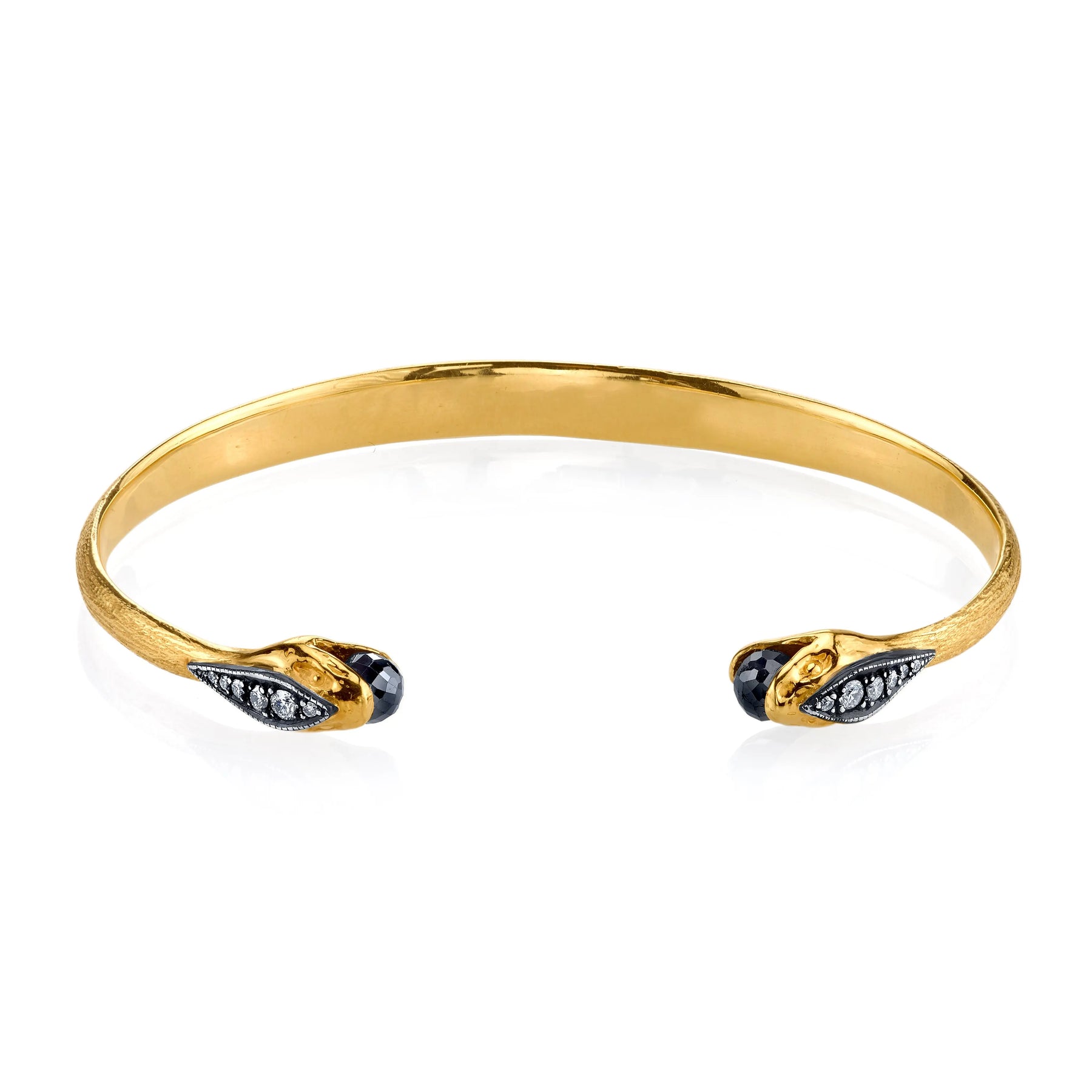 Snake cuff bracelet 18k gold and oxidized silver with black diamond and diamonds