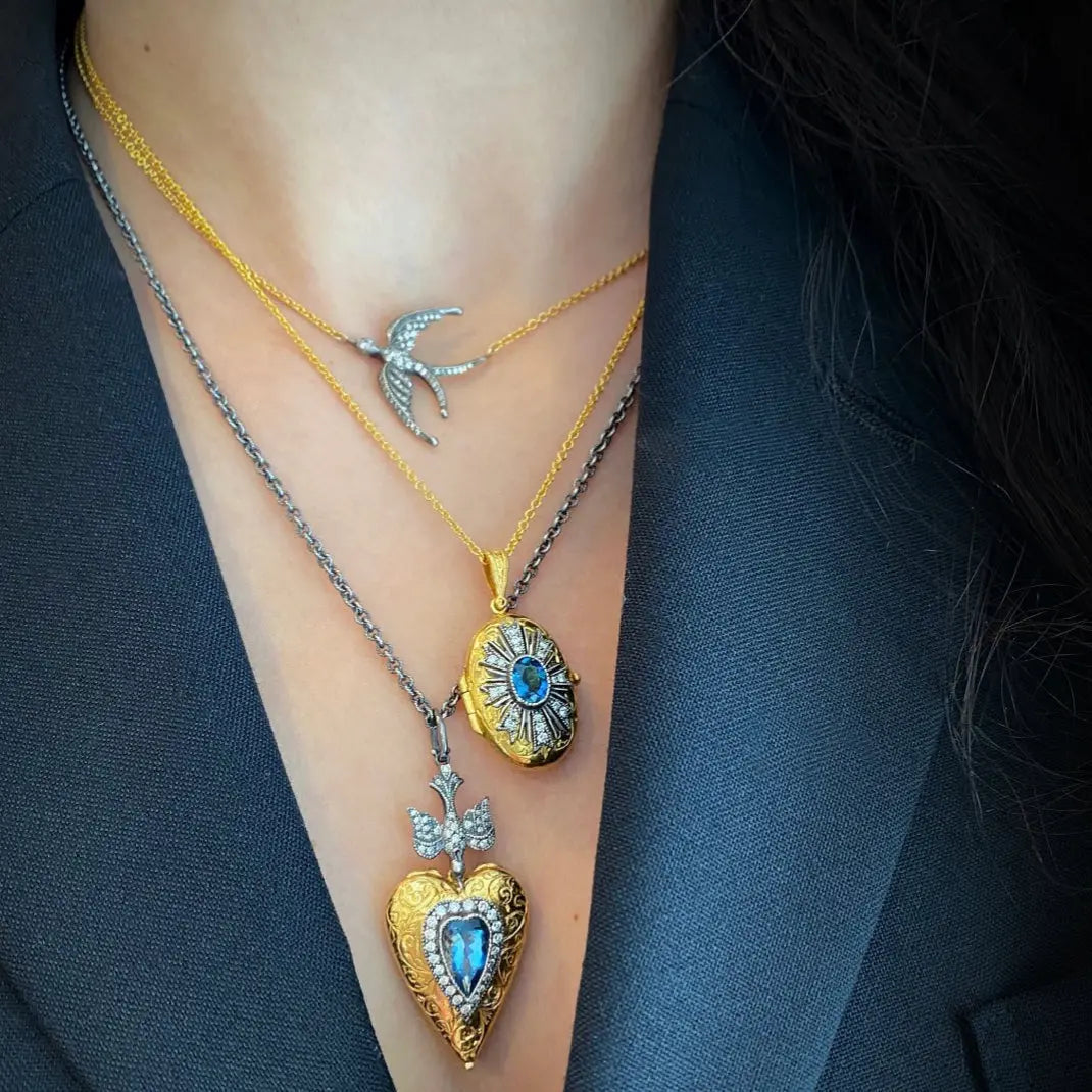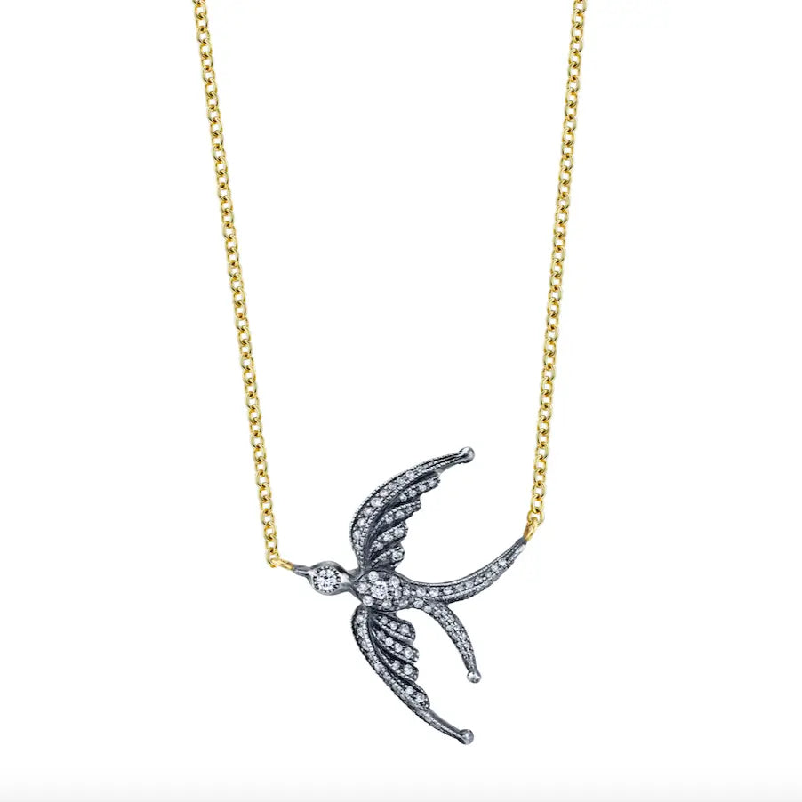 Pave diamond swallow pendant in 22k gold and oxidized silver.